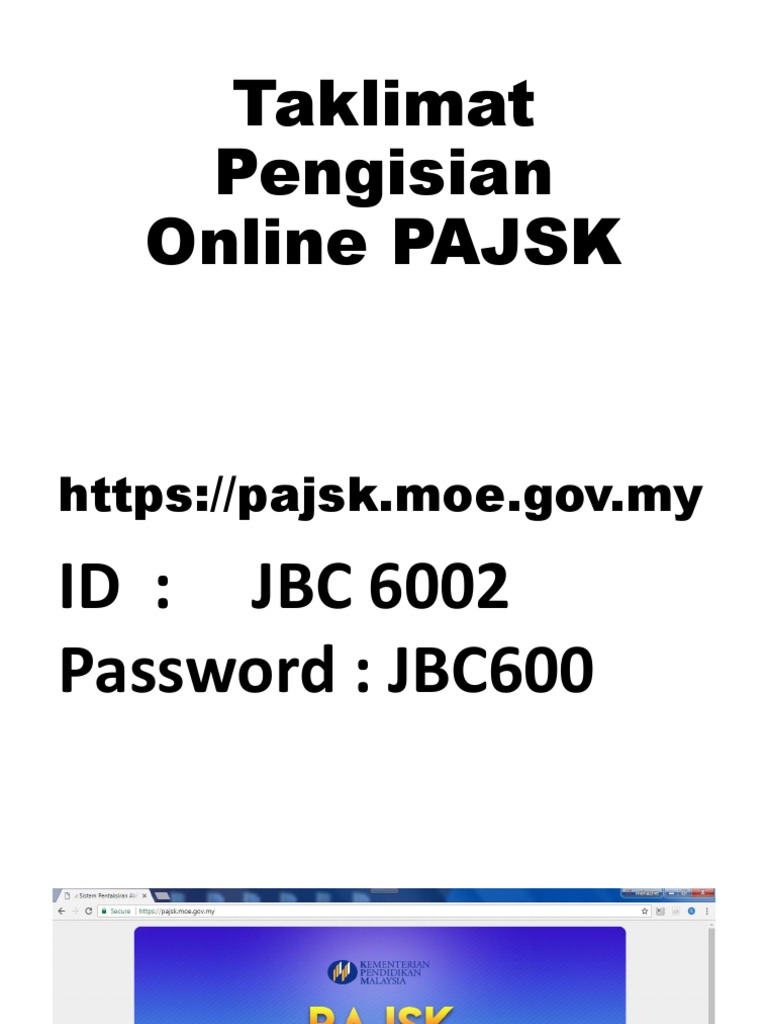Untuk login anda bolehlah klik pautan berikut. Sistem ini adalah pentaksiran yang perlu diduduki atau diambil oleh semua murid sekolah rendah dan menengah dan boleh dilayari menerusi laman web mereka pajskmoegovmy. Pajskmoegovmy Manakala secara offline menggunakan Buku Rekod dan Rumusan PAJSK.