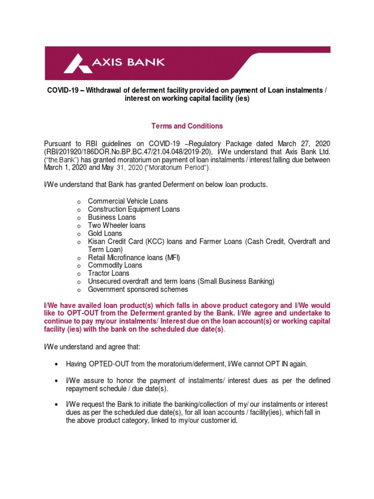 This means you have to inform the bank if you want to avail of the moratorium facility in. It is deemed that borrowers have opted for the moratorium if there is no written communication stating otherwise it added. Borrowers whose cash flows are not impacted and do not wish to avail the moratorium may choose to opt out from the moratorium by sending an email or by reaching out to any of bank branches Axis Bank said adding it is deemed that borrowers have opted for the moratorium if there is no written communication stating otherwise.