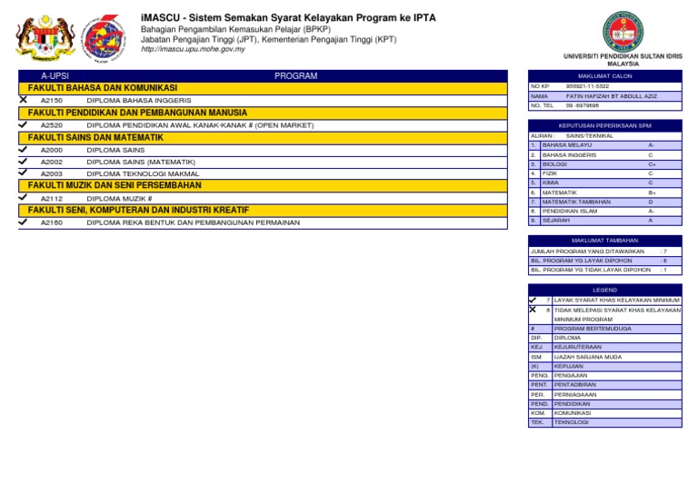 Diploma Reka Bentuk dan Pembangunan PermainanCalon Sains dan Sastera Memenuhi Syarat Am dan. Nama Institusi Universiti Pendidikan Sultan Idris UPSI Alamat. Sebelum membuat permohonan sila pastikan anda mempunyai syarat kelayakan am akademik seperti berikut -Lulus SPM dengan Tiga 3 Lima 5 kepujian termasuk Bahasa Melayu dan Lulus Sejarah mulai SPM tahun 2013.